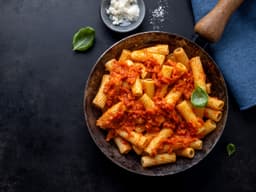Penne bolognese served with ratatouille. Enjoy the vegetables as a side dish, or mix them in to your pasta: the choice is yours