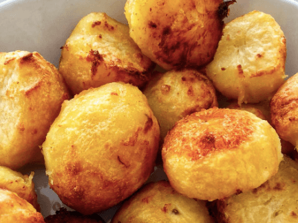 Potatoes are par boiled and edges roughed before roasting in olive oil and rosemary with a sprinkling of semolina to add crispness. These are cooked and frozen ready for you to reheat and serve.