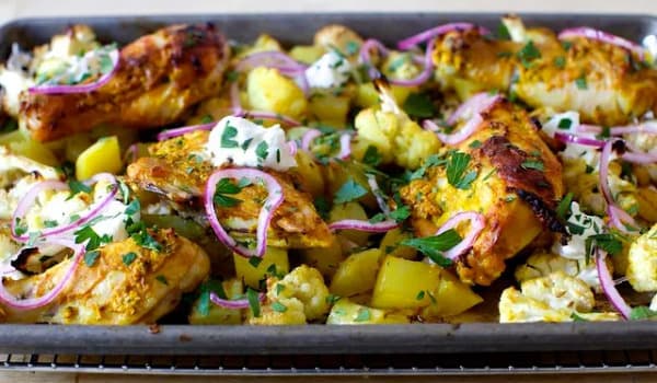 Simply delicious! We marinate juicy chicken thighs in yoghurt and spices and roast with potatoes and cauliflower. Note this is not a chilli hot dish