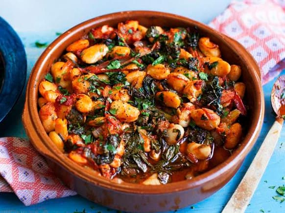 A delicious Spanish style vegetarian dish that can be eaten as a side or the main meal with bread and some greens. The butter beans are meant to be aldente