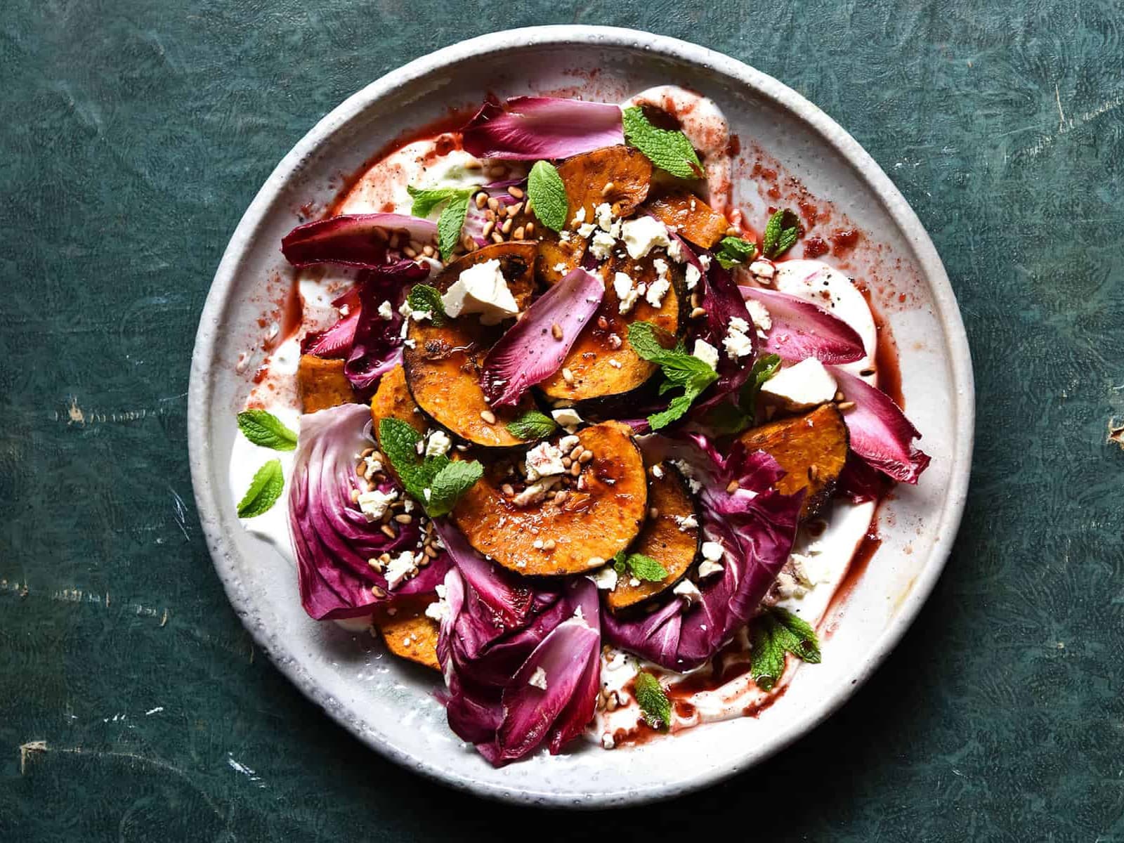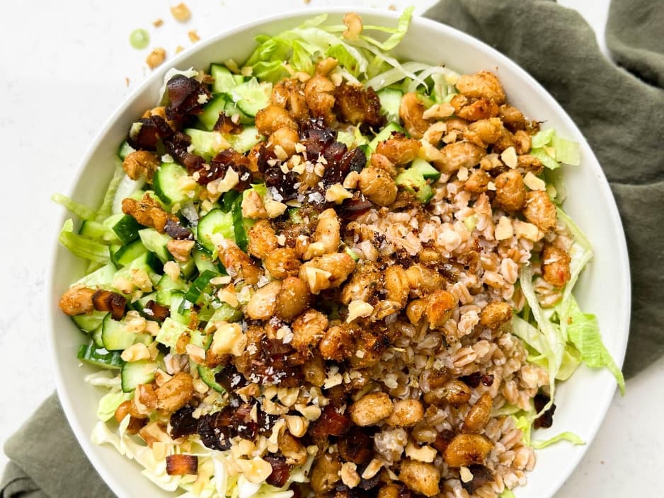 Roasted bean and freekah green salad with tahini dressing