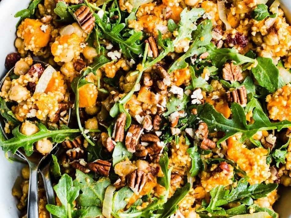 This is one of my new favourite salads. The combination of roasted sweet potato with millet grain, chickpeas, cranberries and pecans provides everything you need for a wholesome meal or side.