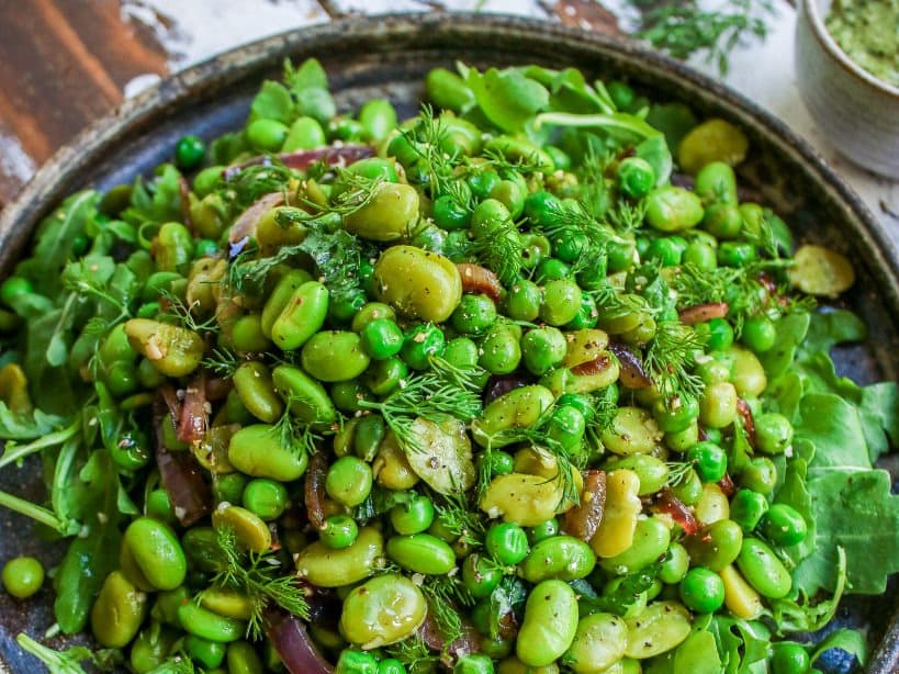 Get all your greens at once - a mixture of green vegetables served with seeds and nuts and a lemony olive oil dressing.