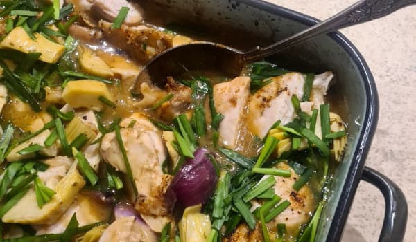 Roast chicken has to be one of my favourite meals. We roast boned chicken with onion, garlic, stock and wine and serve with marinated artichokes. Pan juices combined with lemon and parsley finish this dish perfectly.