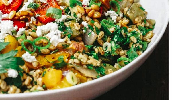 Quinoa has certainly been the trendsetter in recent years however I do love the nuttiness of pearl barley and that it reminds me so much of home and childhood! In thinking about creating a recipe for a vegetable dish using pearl barley I did some research and was pleased to note that it "kicks quinoa's butt for fibre and is only slightly behind for protein! This dish is tossed with a select of roasted vegetables and spices and served with a lemony, garlicy, olive oil dressing. Delicious on its own or with a serve of meat or some falafels! Serve warm, room temp or cold