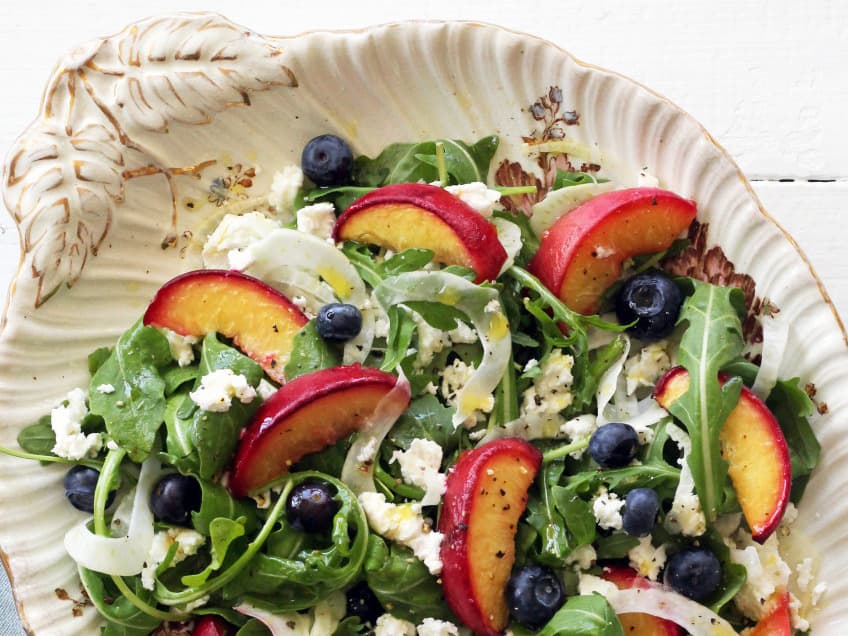 I love a salad which has summer fruits (in this case fresh peaches and blueberries) combined with greens, vegetables, nuts and seets.