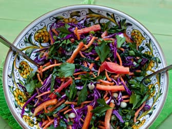 A superfood packed salad including kale, goji berries, sunflower seeds and red cabbage with a delicious citrus dressing.