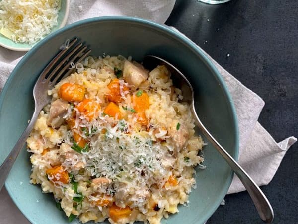 Risotto is the perfect comfort food. We slowly cook the arborio rice in chicken stock and white wine and add chicken, roasted pumpkin and spinach.