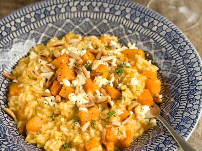 Risotto is the perfect comfort food. We slowly cook the arborio rice in vegetable stock and white wine and add roasted pumpkin and spinach.