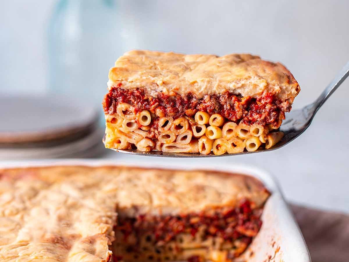 This Greek pastitsio is vegetarian using lentils and mushroom. Please note if you require gluten free to make a note on your order and we will use GF pasta and bechamel.