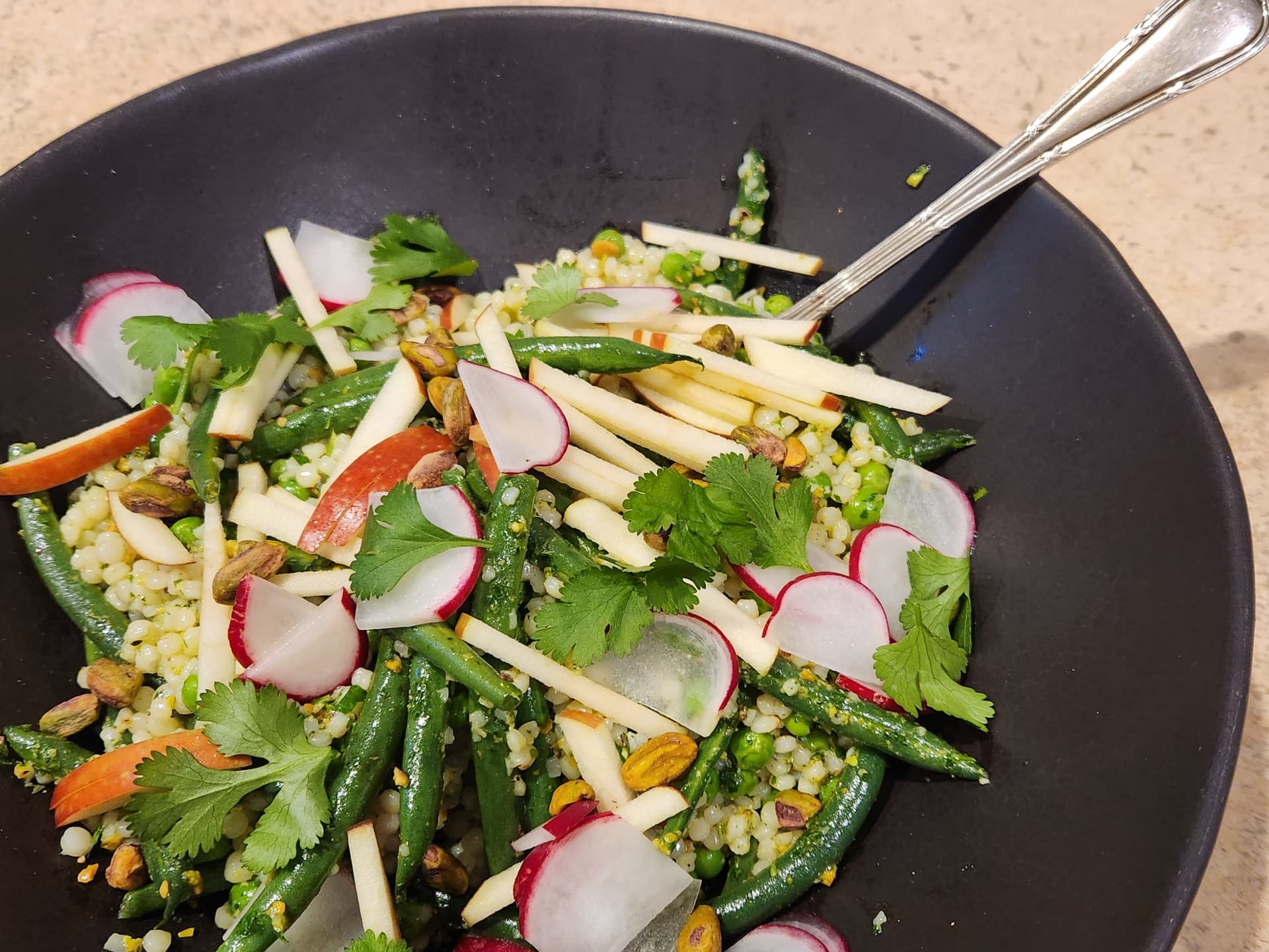 Toasted couscous with beans and a delicious pistachio, herb, garlic and lemon dressing.