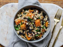 Brown rice, Sweet potato, Maple dressing [Orange juice, Maple syrup], Parsley, Spring onion, Coriander