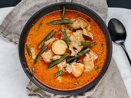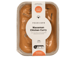 A rich, creamy curry with free-range chicken, potatoes, green bean and lychees. This meal is 500g and does not come with rice. Spice level is mild.