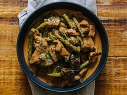 A decadent, dry Malaysian-style curry with slow-cooked beef, eggplant and green beans. This meal is 500g and does not come with rice. Mild spice level.