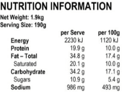 Pastry [Wheat flour, Flex (Vegetable Oils & Fats), Emulsifier (471), Antioxidant (307b), Colour (160a), Raising Agent (920), Milk powder, Eggs], Bacon [Pork, Emulsifiers (451, 450, 452), Dextrose (tapioca maize), Antioxidant (316), Acidity regulator (330), Sodium nitrite (250), Rosemary extract], Cheese [Cheese (Pasteurised Milk, Salt, (Non-animal Rennet), Cultures, Cheese Style Shred (Water, Vegetable Oil, Modified Starch, Milk Protein, Salt, Emulsifying Salt (E34), Colour (E160a), Anti caking agent (starch), Preservative (200)], Vegetable Shortening [Flex (Vegetable Oils & Fats), Emulsifier (471), Soya beans], Wheat flour, Milk powder, Eggs, Cream thickened (Milk), Colour (160a), Vegetable booster, Nutmeg, Salt, Black pepper
