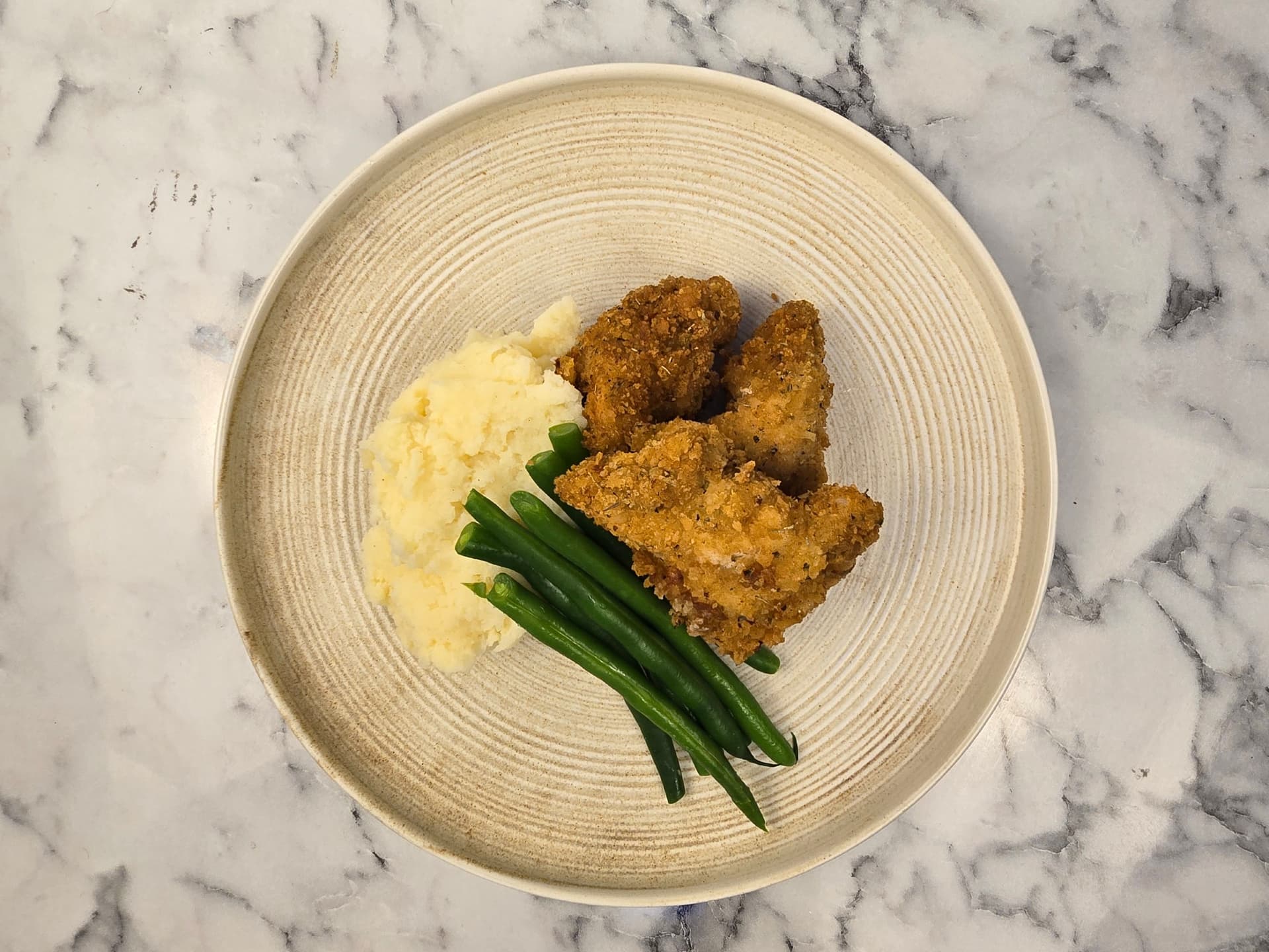 Golden, crispy chicken schnitzel paired with creamy mash potatoes and tender green beans.