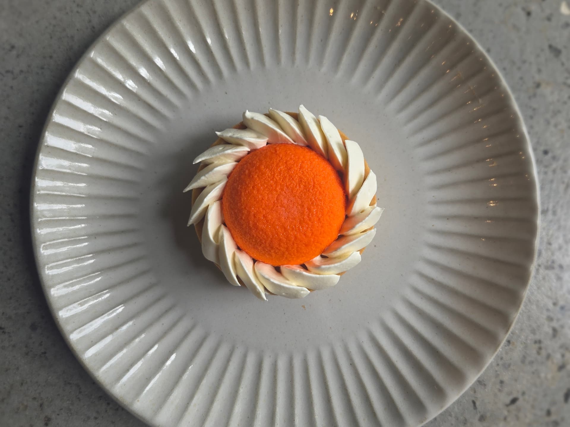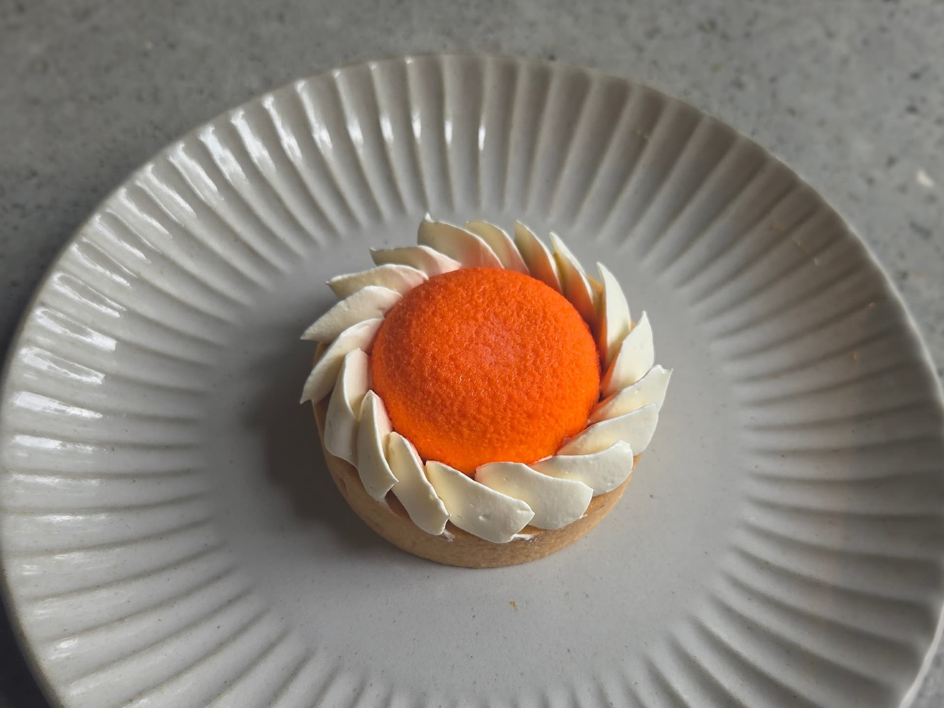 The taste of summer has arrived. Bright and fruity, layers of luscious mango compote, tangy passionfruit & lemon curd, and mango mousse. Sits on vanilla sponge and with a bright sunrise coating.