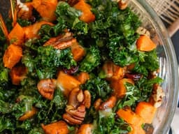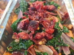 Sweet potato, Pecans, Cavolo nero, Dried cranberries, Sesame and Maple Dressing [Canola oil, Extra virgin olive oil, Water, Maple syrup, Our Honey, Apple cider vinegar, Tahini (Sesame), Salt], Ras el hanout, Himalayan salt