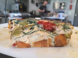 Egg (Free Range), Sweet potato, Red Onion, Leek, roasted Red Pepper, Milk, Cream - Thickened (Milk), Dill, Mixed fresh herbs, Sheeps Feta (Milk), Baby spinach