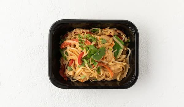 Rice noodles, chicken, egg, vegetables and Peanuts with traditional Thai flavours.