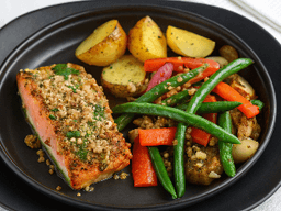 Salmon (Fish), Potato, Green Beans, Roasted capsicum, Onion, Almonds, Seeded mustard, Lime, Olive Oil, Red wine vinegar, Salt, Black Pepper, Dill