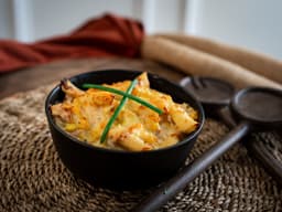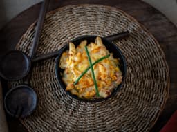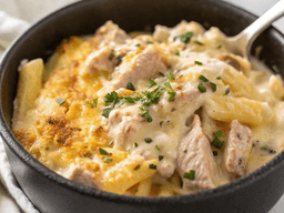 An old-fashioned favourite: tuna, corn, and spring onion in a cheesy cream sauce, mixed through penne pasta.