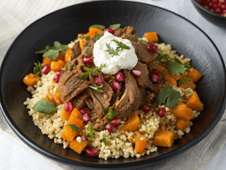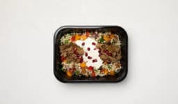 Slowly cook marinated lamb until it starts to fall apart, served on a bed of pearl cous cous with roasted vegetables, accompanied by a spiced yoghurt for you to stir through after heating