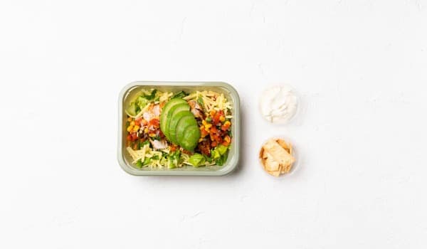 Grilled Mexican spiced chicken breast with crisp cos lettuce, corn salsa, tomato salsa, avocado and tasty cheese. Accompanied by tortilla chips and sour cream
