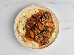 Rich tomato flavoured gravy with tender chunks of beef and vegetables served with mash.