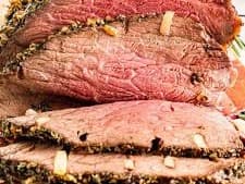 Succulent roast beef cooked and sliced ready to heat and eat.