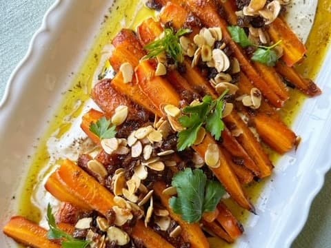 Whole roasted carrots served with garlic and almond puree topped with a sweet and sour raisin a great accompaniment to you glazed ham, grilled salmon or roast chicken this Christmas