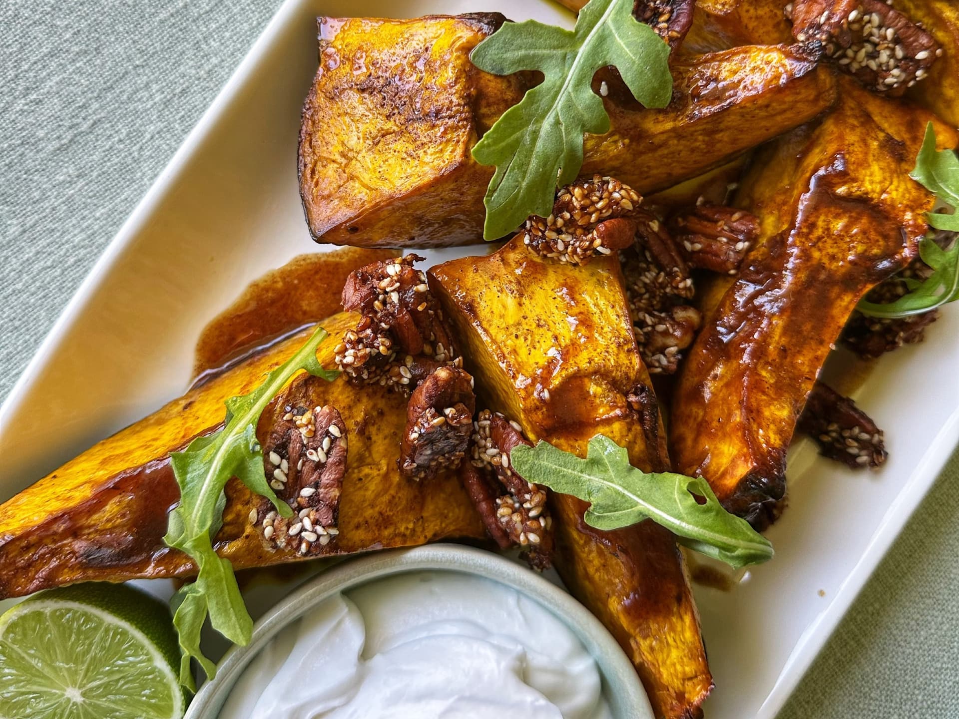 Roasted wedges of jap pumpkin lightly spiced with cinnamon bringing some Christmas warmth serve warm with coconut yoghurt and a sprinkling of miso pecans for some crunch.
