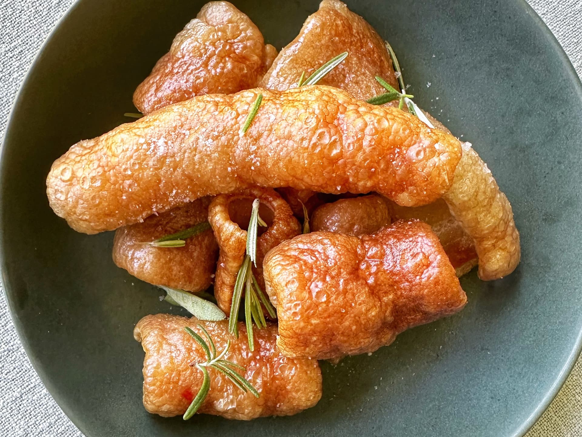 Pasture raised pork skin dehydrated ready to pop in a hot oven to puff and crisp up for some salty porky crunch