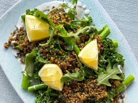 Bright green broccolini drizzled with lemon tahini topped with crunchy falafel crumbs this plate of greens is sure to be enjoys by all