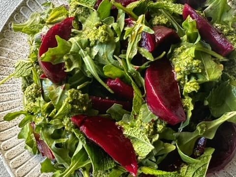 Purple beets marinated in maple and sherry vinegar served with pistachio and mint pesto, wild rocket