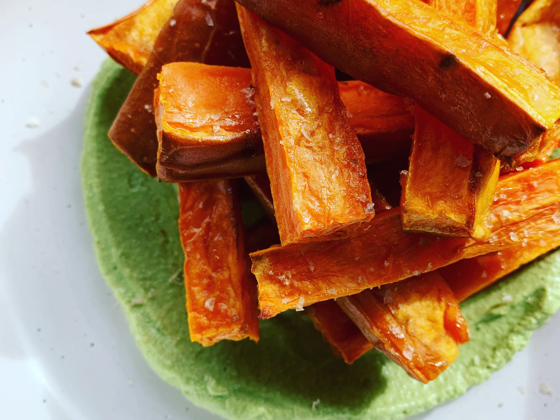 Chunky sweet potato wedges baked in olive oil salt and pepper served with green tahini sauce.