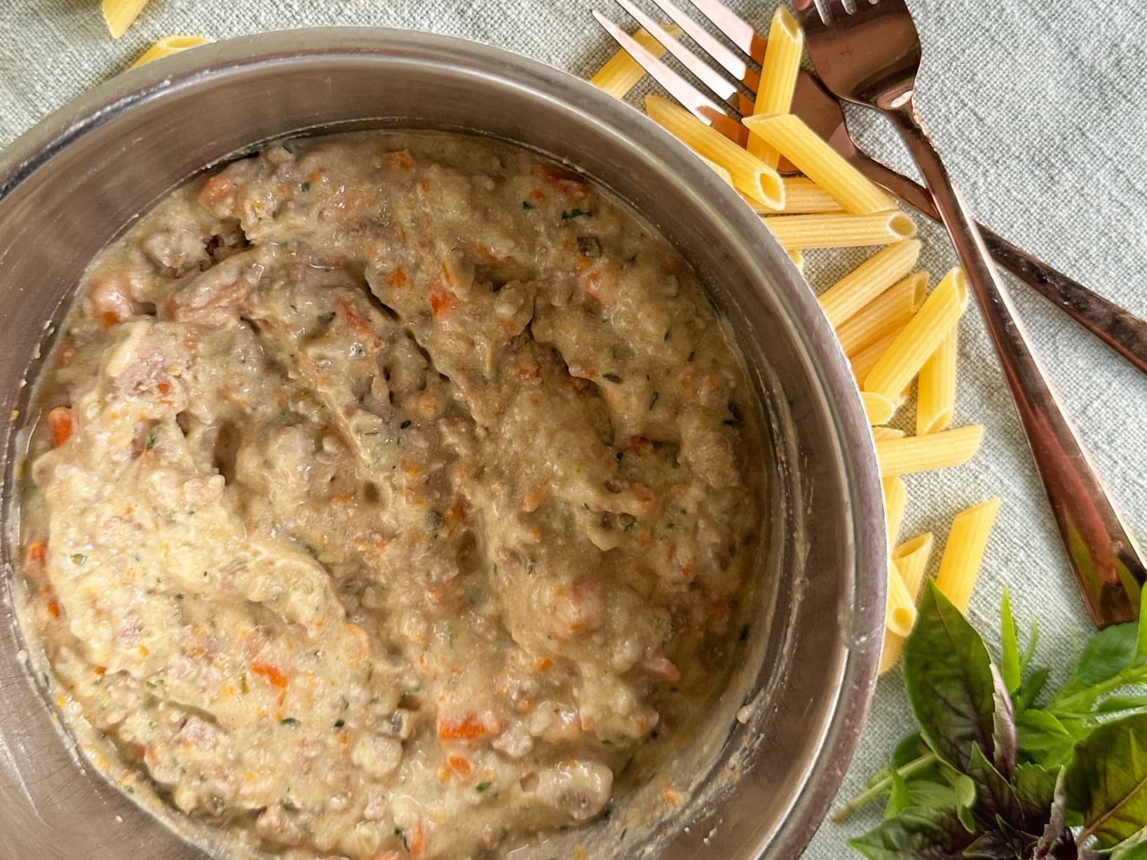 A vegetable Bolognese pasta sauce of cauliflower, mushrooms flavoured with chilli and rosemary in a tomato garlic sugo to add to your pasta making for a fast meat free meal.