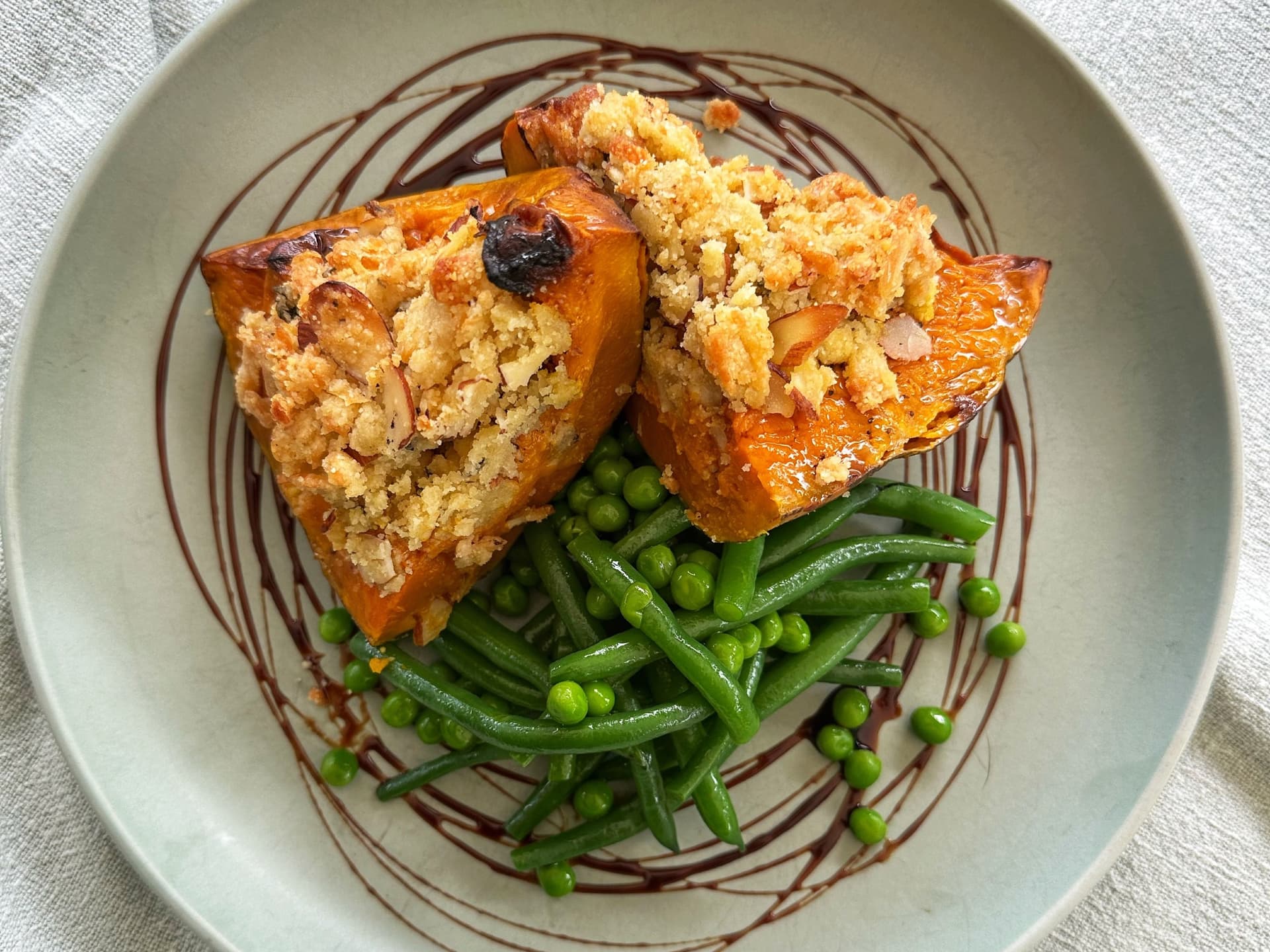 Roasted jap pumpkin topped with a parmesan and almond crust, steamed green beans and peas on the side a tasty addition to any main meal.