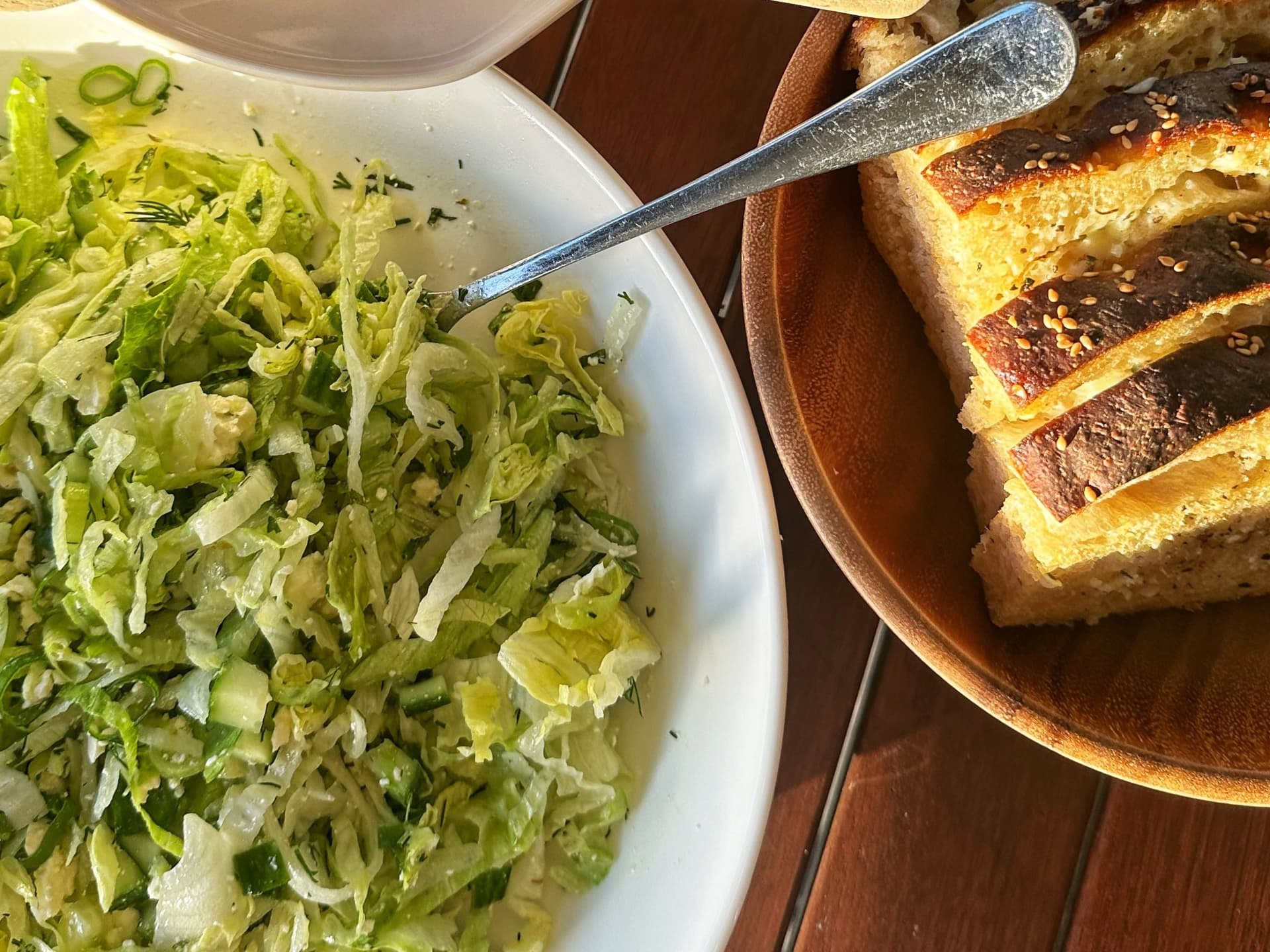 This salad is crisp light a refreshing, iceberg lettuce, cucumber, herbs and feta in a lemon olive oil dressing