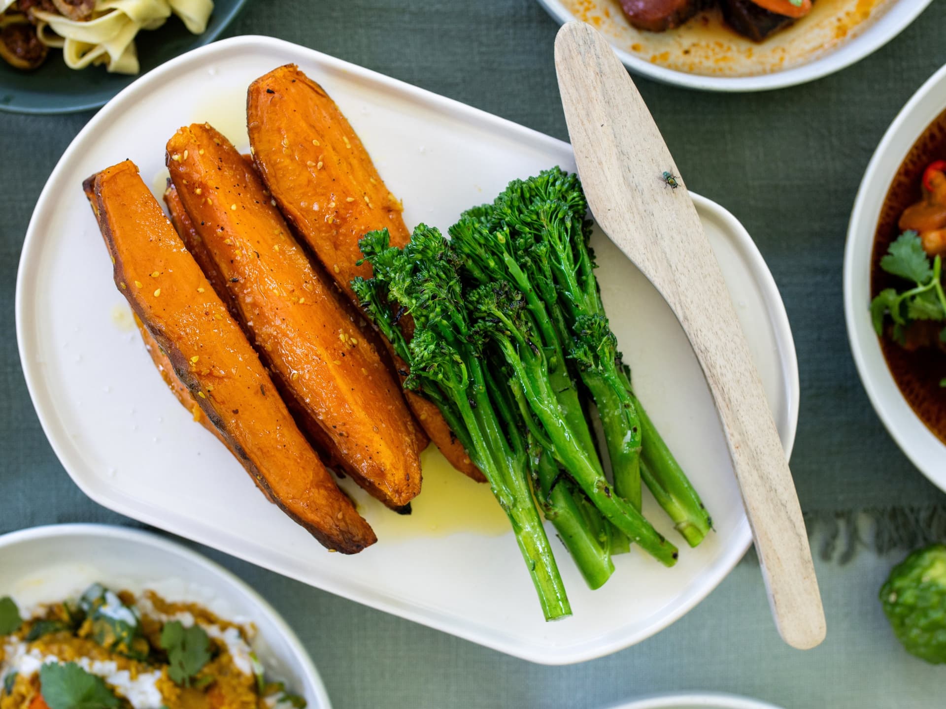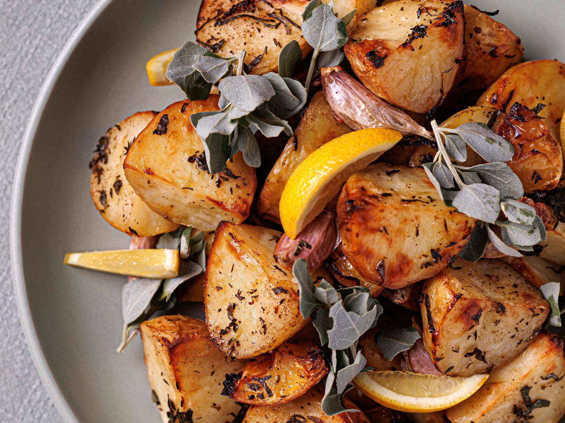 Big chunks of potato roasted with chicken stock lemon garlic and salt bush a handy side to any main this week.