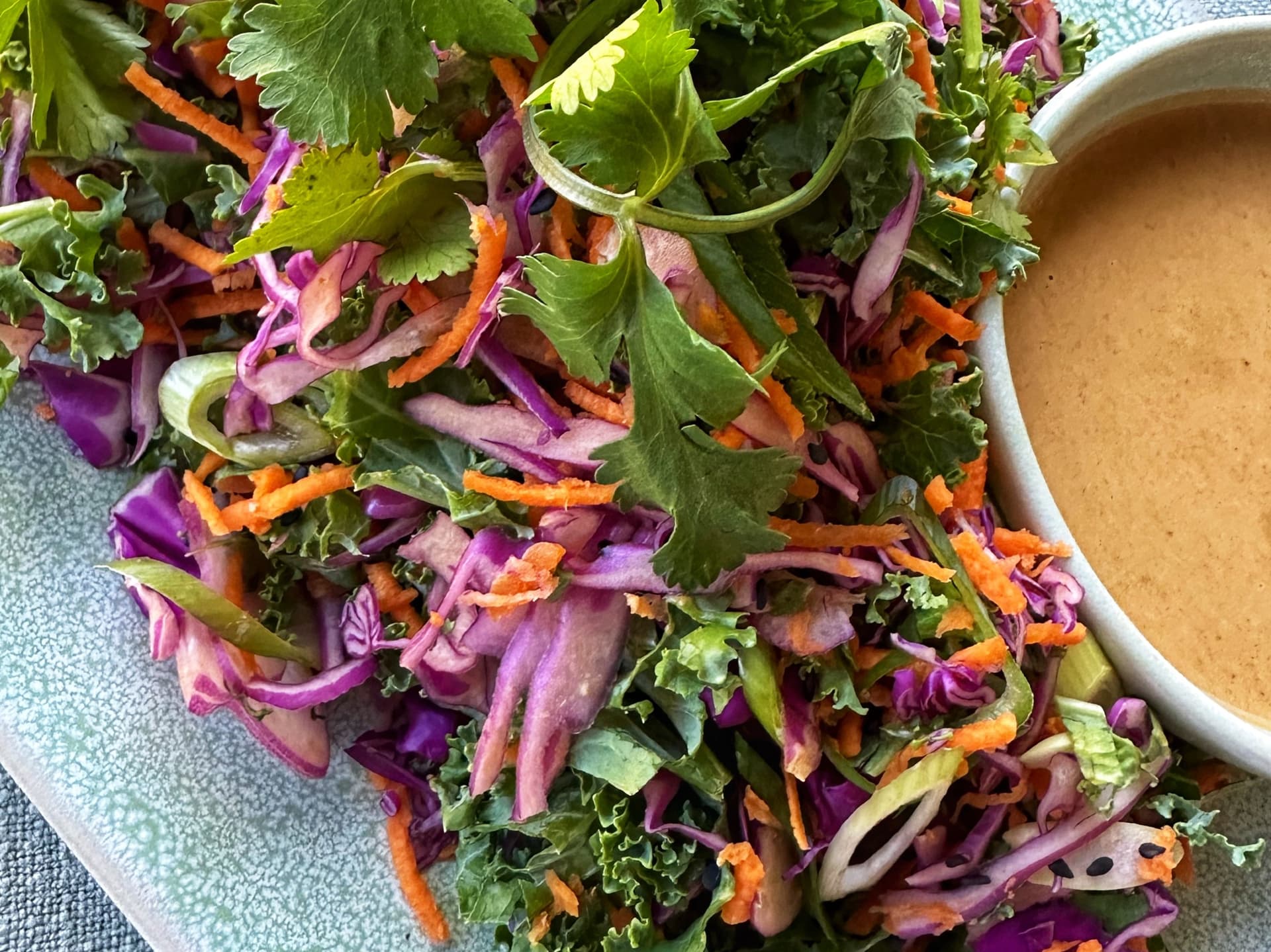 A healthier slaw of kale, red cabbage, spring onion drizzle over peanut and ginger dressing toss and enjoy with favorite grilled tofu or favorite grill meat.