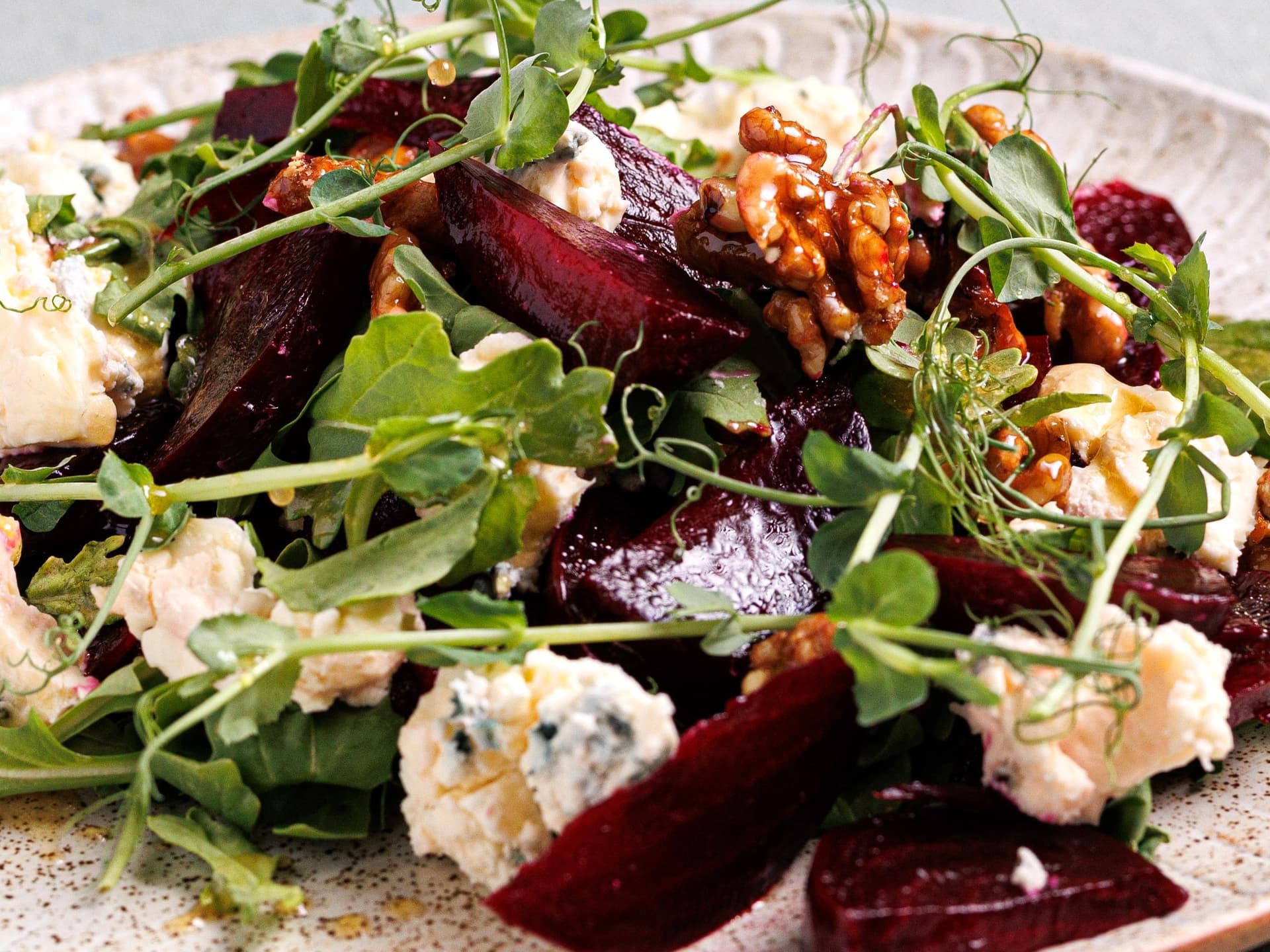 Roasted beetroot, honey roasted walnuts, rocket and creamy blue cheese a classic combination.