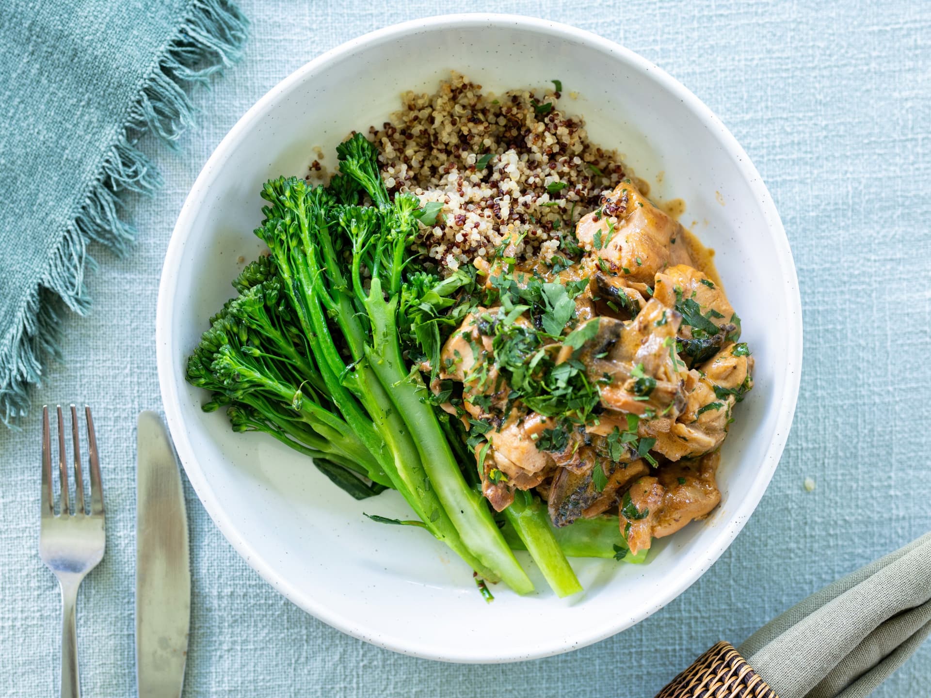 A comforting classic with a chicken twist, Freerange chicken, bacon and mushroom deglazed with wine simmered with homemade stock tomato and sour cream finished with parsley toss with pasta or serve with mash and vegetables.