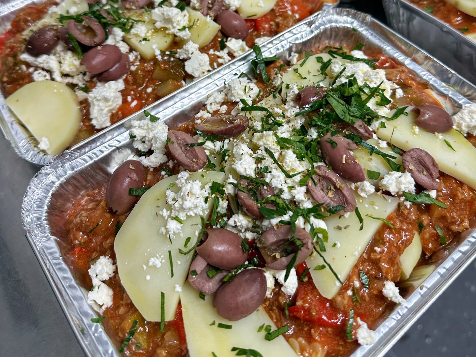 100% Grass feed lamb mince simmered with garlic, tomato capsicum herbs and stock layered with potato topped with feta and olives is ready to bake and serve with fresh salad or steam greens on the side.