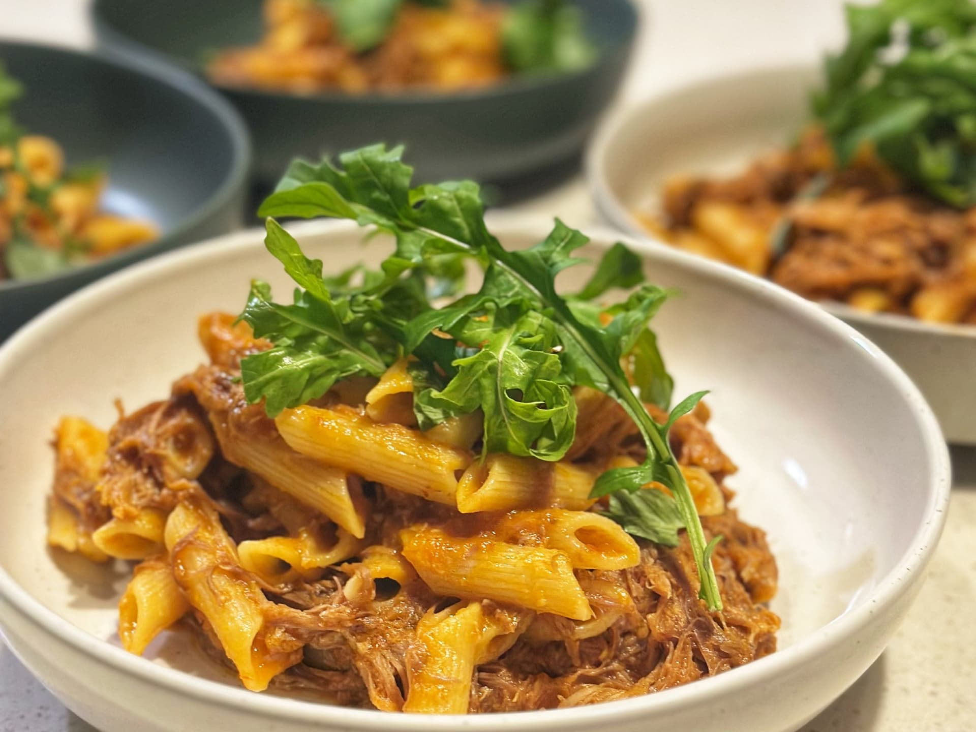 Pastured raised pork slow cooked pulled simmered in tomato and fennel sauce ready warm and toss with your favorite pasta sauce.