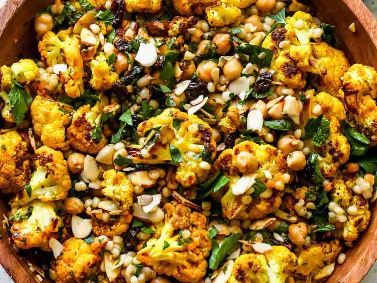 Golden-roasted turmeric cauliflower florets tossed with fluffy couscous, asparagus, cashews, parsley, raisons, black sesame seeds. Served with a lemon tahini dressing. Est serves 6-8.