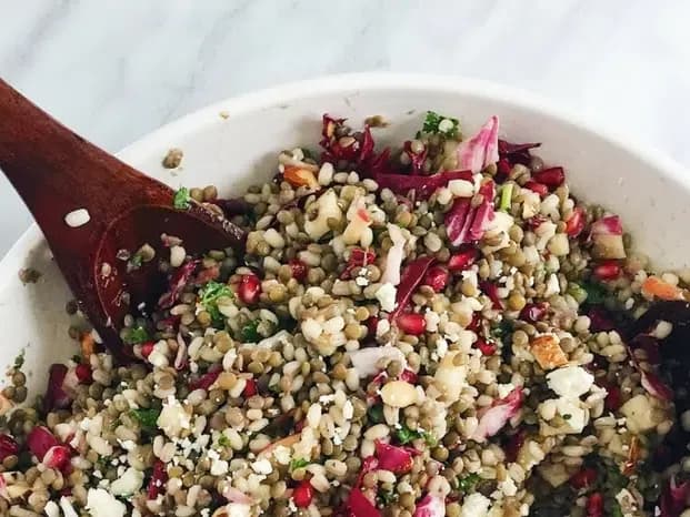 A hearty blend of puy lentils, pearl barley, farro, feta cheese & roasted pumpkin. Served with a pomegranate molasses dressing. Est serves 6-8.