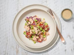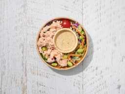 Brown rice, Salmon (Fish), Edamame beans (Soy), Roasted Sesame Dressing [Sesame seed, Apple juice, Vinegar, Soy sauce (Wheat), Peanut paste, Water, Rice, Alcohol, Sugar, Japanese rice wine, Barley malt, Salt, Sesame paste, Grape fermented seasoning, Emulsifier (473, 475), Thickener (415), Yeast extract (Wheat), Sesame oil, Vegetable oil], Cherry tomatoes, Cucumber, Wakame, Red cabbage, Carrots, Red onion