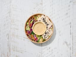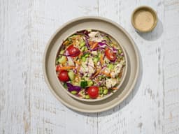 Brown rice, Chicken breast, Edamame beans (Soy), Roasted Sesame Dressing [Sesame seed, Apple juice, Vinegar, Soy sauce (Wheat), Peanut paste, Water, Rice, Alcohol, Sugar, Japanese rice wine, Barley malt, Salt, Sesame paste, Grape fermented seasoning, Emulsifier (473, 475), Thickener (415), Yeast extract (Wheat), Sesame oil, Vegetable oil], Cherry tomatoes, Cucumber, Wakame, Red cabbage, Carrots, Red onion