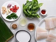 Hoki (Fish), Coconut milk, Flour plain (GF), Coriander, Salted butter (Milk), Ginger, Minced garlic, lemongrass, Fish sauce GF, Mild chilli